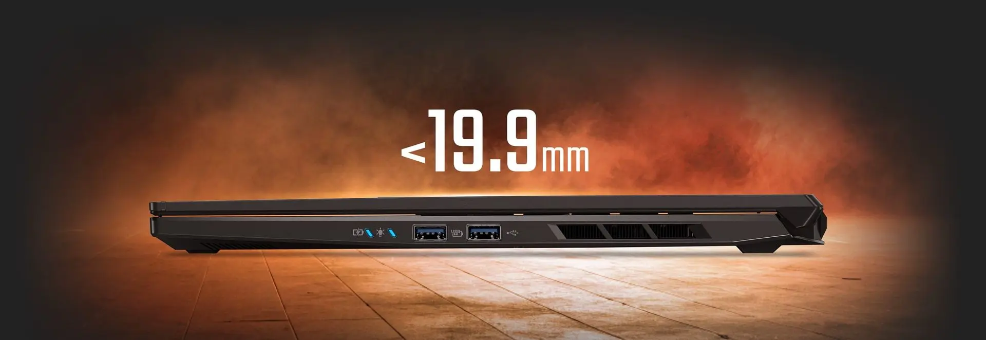Move freely with a chassis under 19.9mm. Metal top and bottom covers, 4-zone RGB keyboard, and clean lines built for life on the move.
